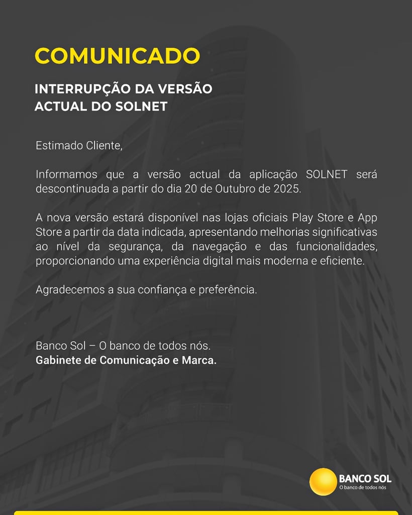 Informamos que a versão actual da aplicação SOLNET será descontinuada a partir do dia 20 de Outubro de 2025.